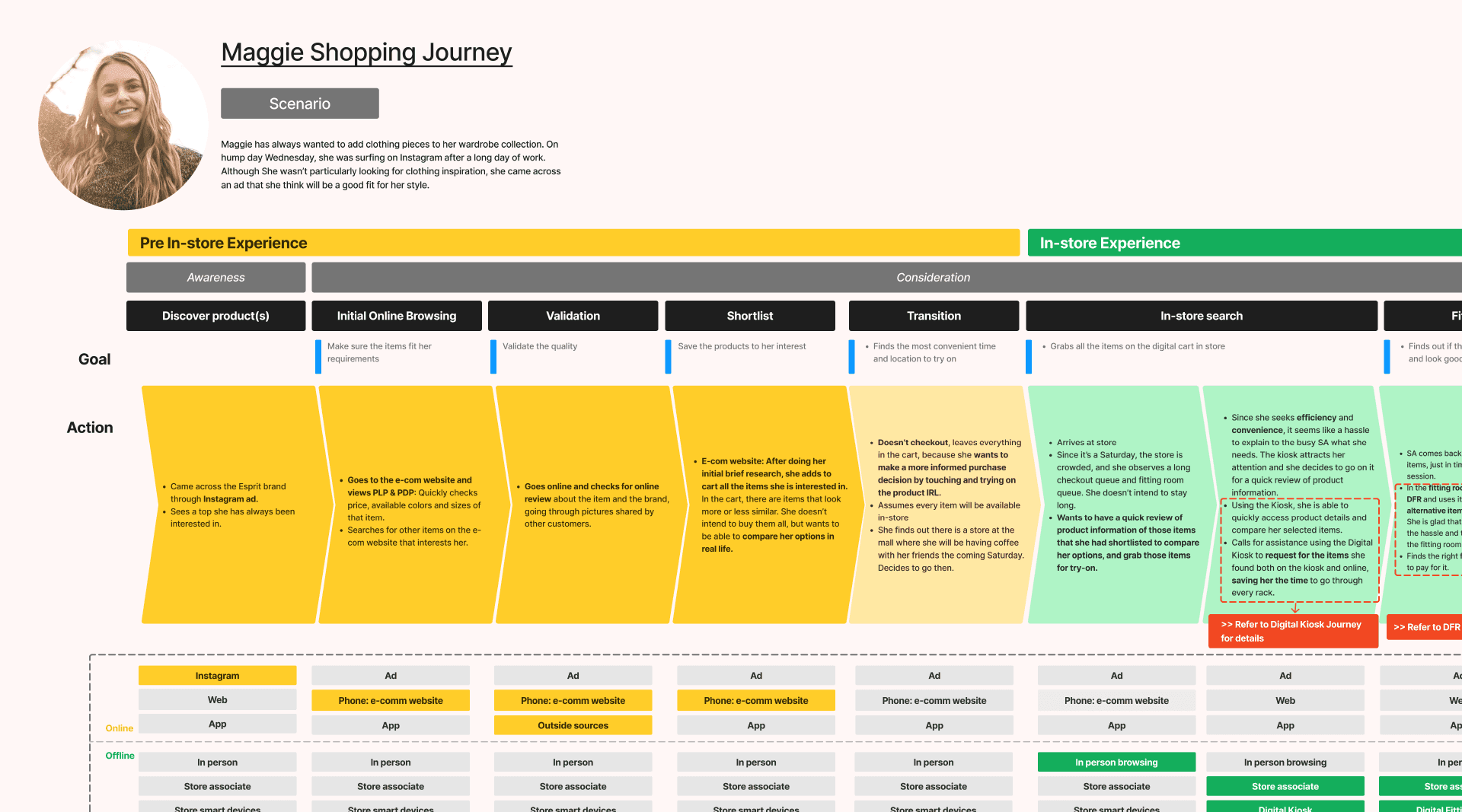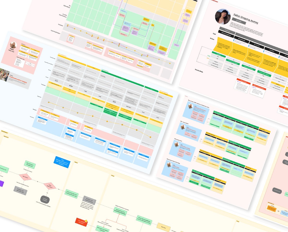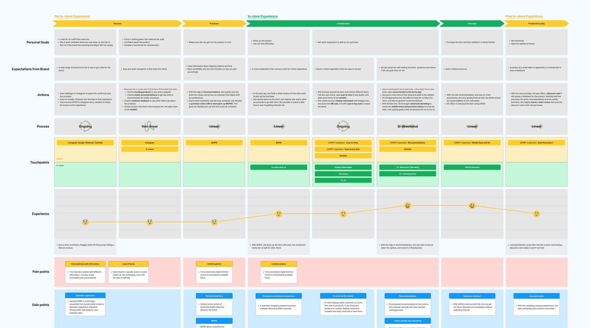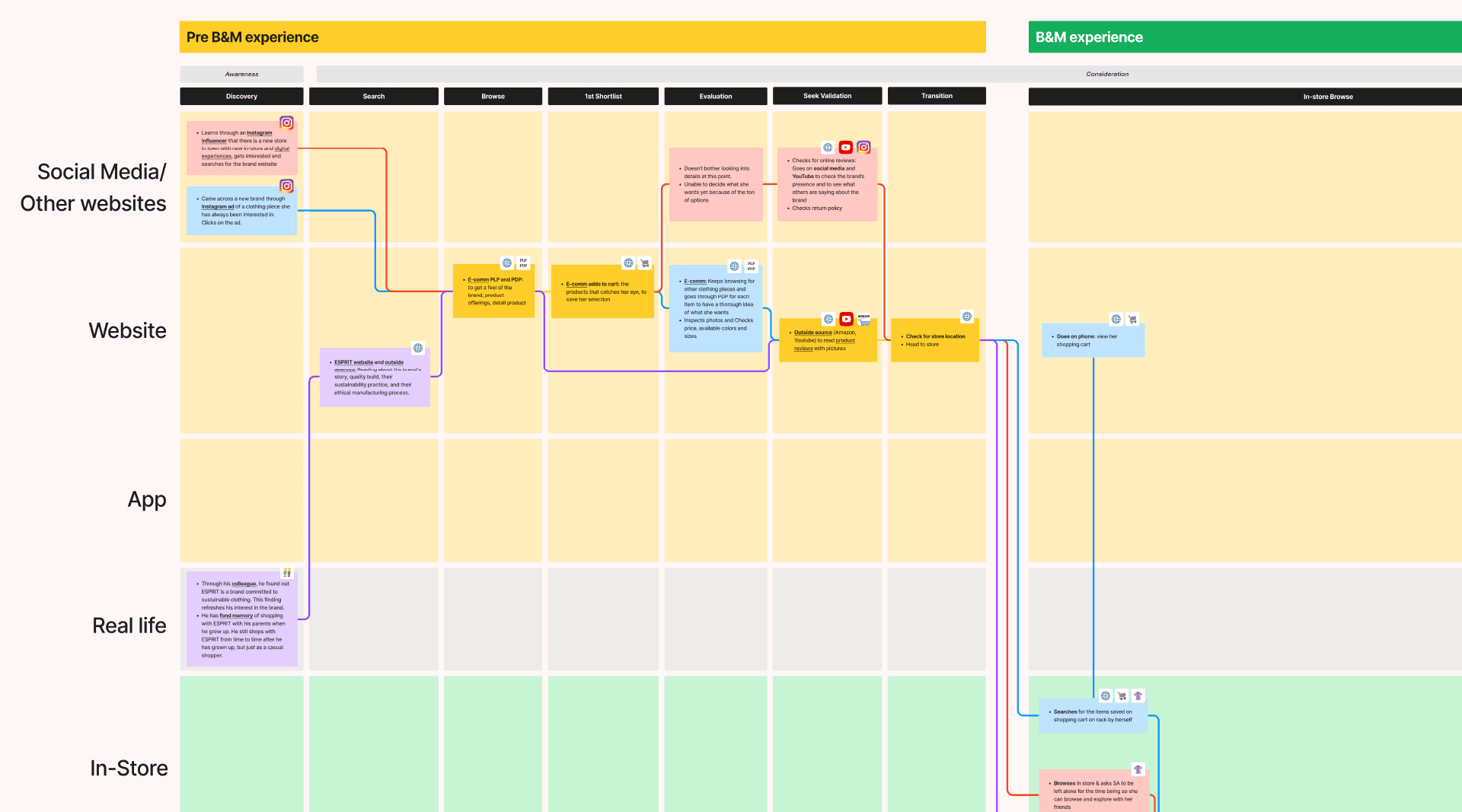 We began by analyzing the individual generic shopping journeys for each persona to identify potential friction and pain points at every touchpoint through their goals, actions and rationalities.